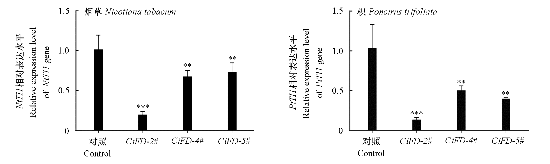 Fig. 6 Analysis of the expression levels of the NtTI1 gene and the PtTI1 gene in CiFD gene overexpressing plants The independent sample t-test was used for significance analysis. ** indicated a significant level of difference(P < 0.01),and *** indicated a very significant level of difference(P < 0.001)