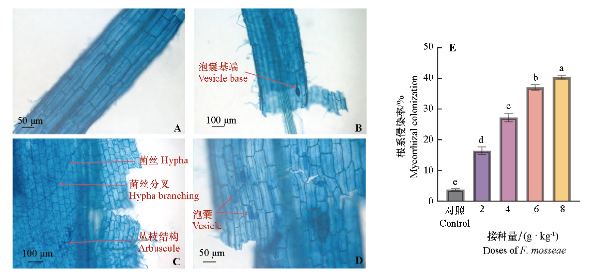 Fig. 1 Root colonization status and colonization rate of sand-cultured pepper inoculated with different doses of Funneliformis mosseae(70 d) A:Control;B-D:Hyphae,arbuscules and vesicles. Different lowercase letters indicate significant differences among different treatments(P < 0.05). The same below