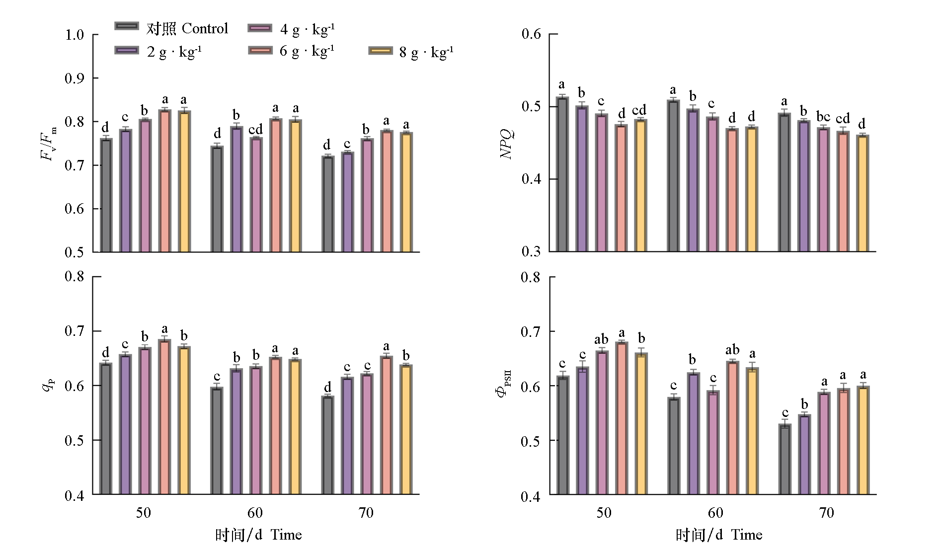 | 70 | 对照Control | 28.40 ± 0.54 c | 4.99 ± 0.07 c | 26.40 ± 0.79 d | 4.46 ± 0.92 b | 2.20 ± 0.09 d | 0.38 ± 0.02 d |