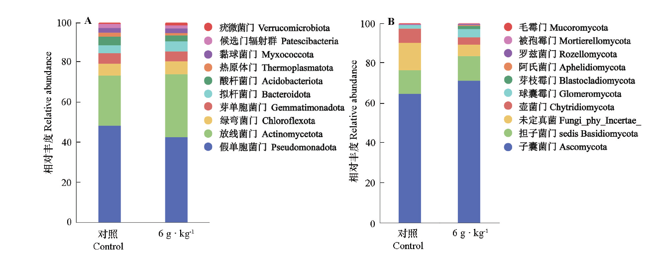 Fig. 6 Effects of Funneliformis mosseae inoculation on the phylum-level community composition of rhizosphere bacteria(A)and fungi(B)in sand-cultured pepper