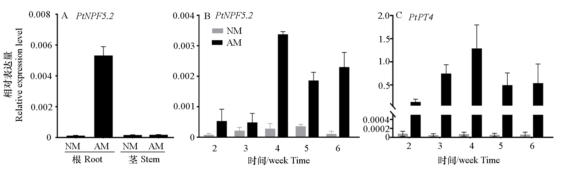 Fig. 1 Expression analysis of PtNPF5.2 in Poncirus trifoliate A:Expression levels of PtNPF5.2 in different tissues;B:Expression levels of PtNPF5.2 at different time points after inoculation with AMF;C:Expression levels of PtPT4 at different time points after inoculation with AMF. NM:Non-mycorrhizal plants,AM:Mycorrhizal plants