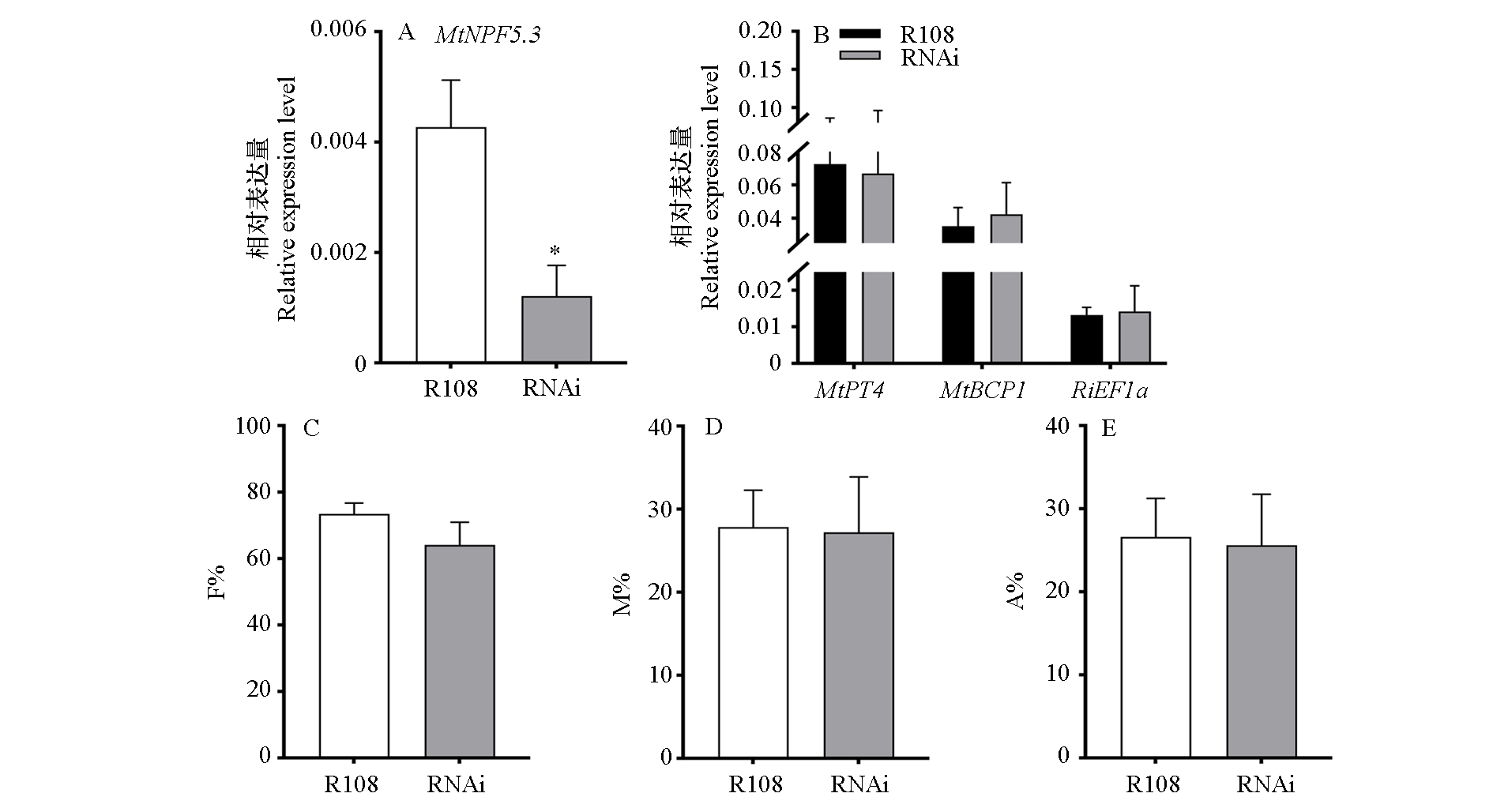 Fig. 5 Analysis of gene expression and AMF colonization in MtNPF5.3 RNAi plants of Medicago truncatula A:Relative expression level of MtNPF5.3 in R108 and RNAi plants;B:Relative expression levels of AM symbiosis marker genes MtPT4,MtBCP1,and RiEF1α in R108 and RNAi plants;C-E:Statistics analysis of AMF colonization. F%:Percentage of root fragments colonized by hyphae,M%:Intensity of hyphal colonization in whole roots,A%:Arbuscule abundance in whole roots. t-test,* P < 0.05. The same below