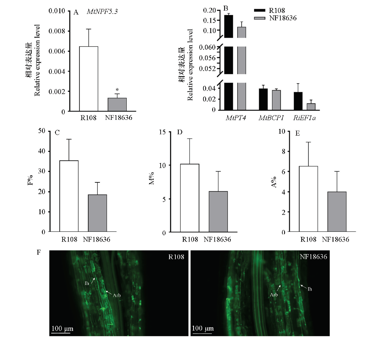 Fig. 6 Analysis of gene expression and AMF colonization in the MtNPF5.3 insertion mutant NF18636 of Medicago truncatula A:Relative expression level of MtNPF5.3 in wild-type R108 and mutant NF18636;B:Relative expression levels of AM symbiosis marker genes MtPT4,MtBCP1,and RiEF1α in R108 and NF18636;C-E:Statistics of AMF colonization;F:Microscopic images of mycorrhizal structures in roots of R108 and NF18636. Ih:Intraradical hyphae,Arb:Arbuscules