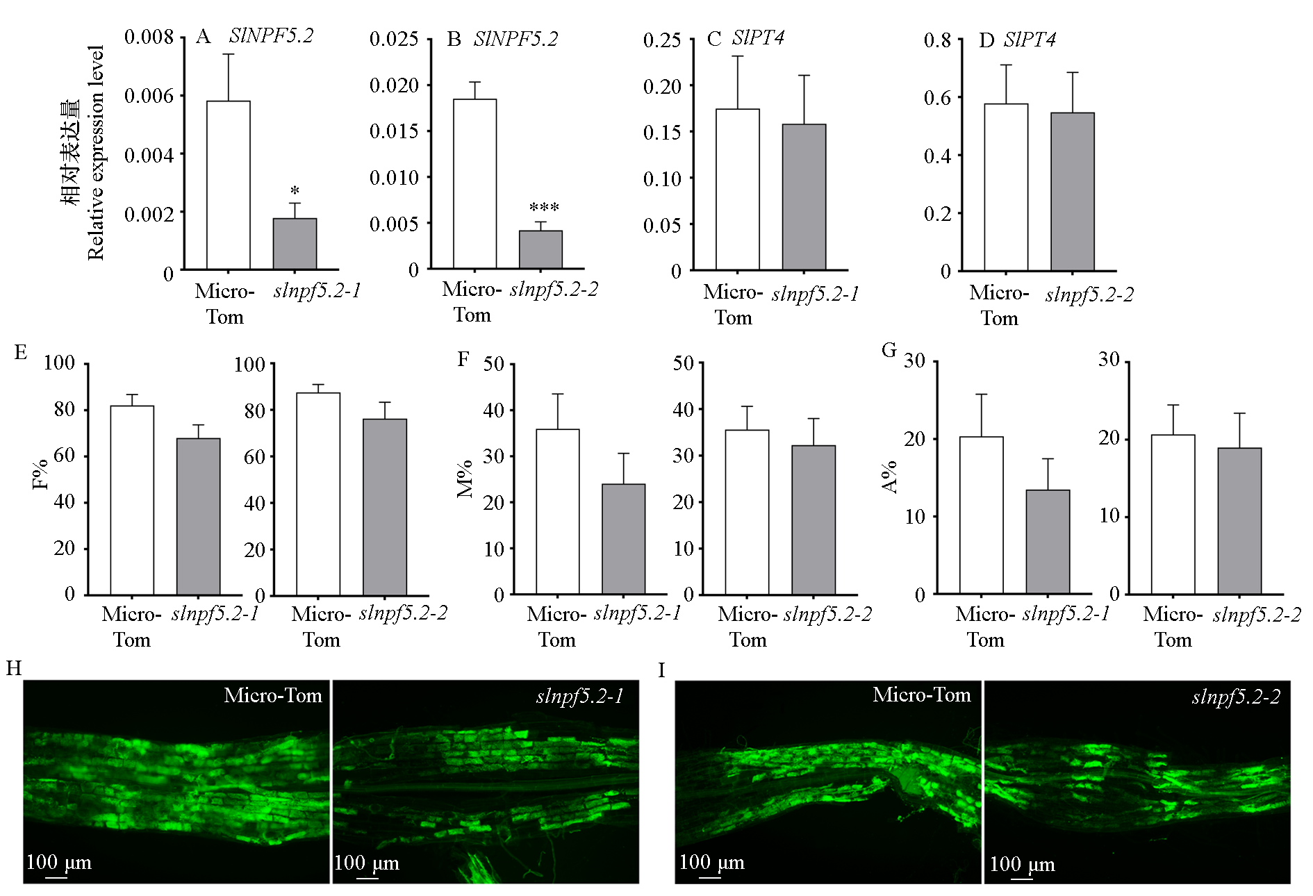 Fig. 7 Analysis of gene expression and AMF colonization in SlNPF5.2 knockout tomato plants A-D:Relative expression levels of SlNPF5.2 and AM symbiosis marker gene SlPT4 in‘Micro-Tom'and two knockout lines(slnpf5.2-1 and slnpf5.2-2);E-G:Statistics of AMF colonization;H-I:Microscopic images of mycorrhizal structures in the roots of‘Micro-Tom'and the two knockout lines. * P < 0.05;***P < 0.001