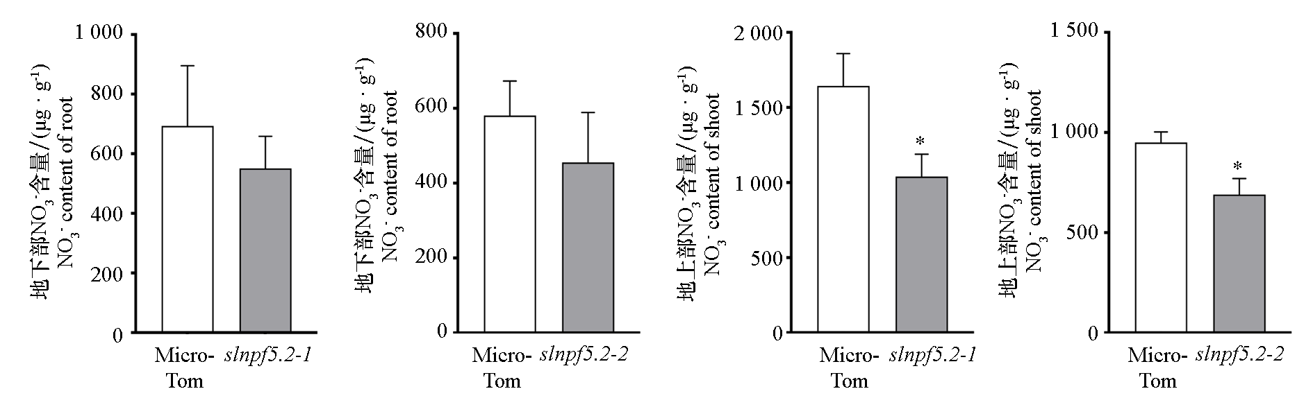 Fig. 8 NO3- content in roots and shoots of SlNPF5.2 knockout tomato plants Knockout lines slnpf5.2-1 and slnpf5.2-2 each have their own wild-type control‘Micro-Tom'