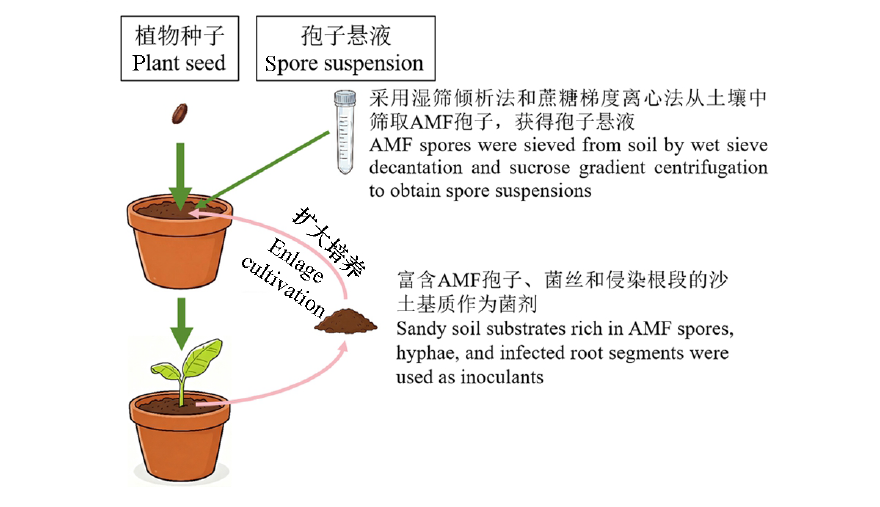 Fig. 3 Potted sand soil cultivation method The green arrow indicates the initial cultivation process,where plant seeds and spore suspensions are inoculated into potted plants until a sandy soil substrate rich in AMF spores,mycelium and infected root segments is obtained as the inoculant. The pink arrow indicates the process of expanded culture,where sandy soil substrate is used as the inoculant for repeated culture to obtain a large number of spores