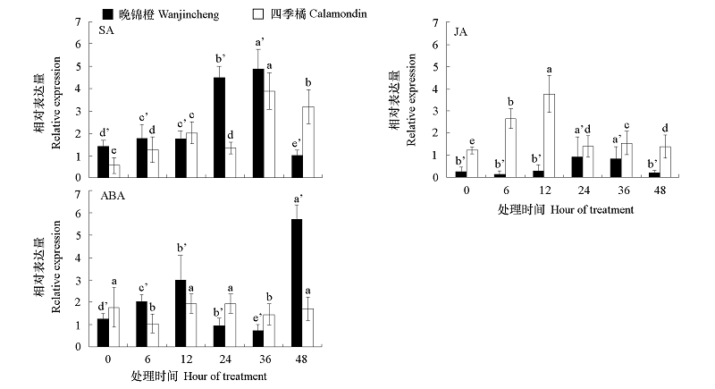 Fig. 4 The relative expression of CsKat01 induced by SA,JA and ABA The data significant difference of Calamondin and Wanjincheng is indicated by a and a’ respectively,and different letters indicate significant difference,P < 0.05. The same below.