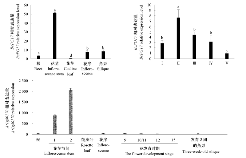 Fig. 5 Analysis of the expression pattern of BcPG17 and the ATH1 GeneChip data of At1g80170 from Arabidopsis database Ⅰ ~ Ⅴ indicate the buds of pollen mother cell stage,tetrad stage,uninucleate microspore stage,binucleate microspore stage and mature pollen respectively.